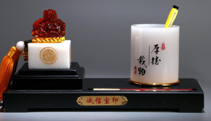 【材質(zhì)】玉石 琉璃玉 木座 銅筆