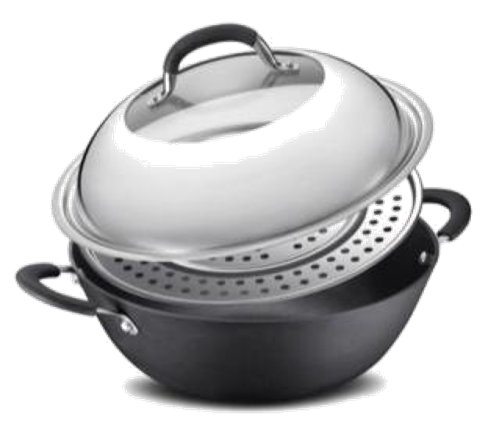 高拱半玻蓋設計,大空間,大容量,配合蒸篦,可蒸更多食物,鋼化玻璃精嵌其中,讓烹飪過程清晰可見;