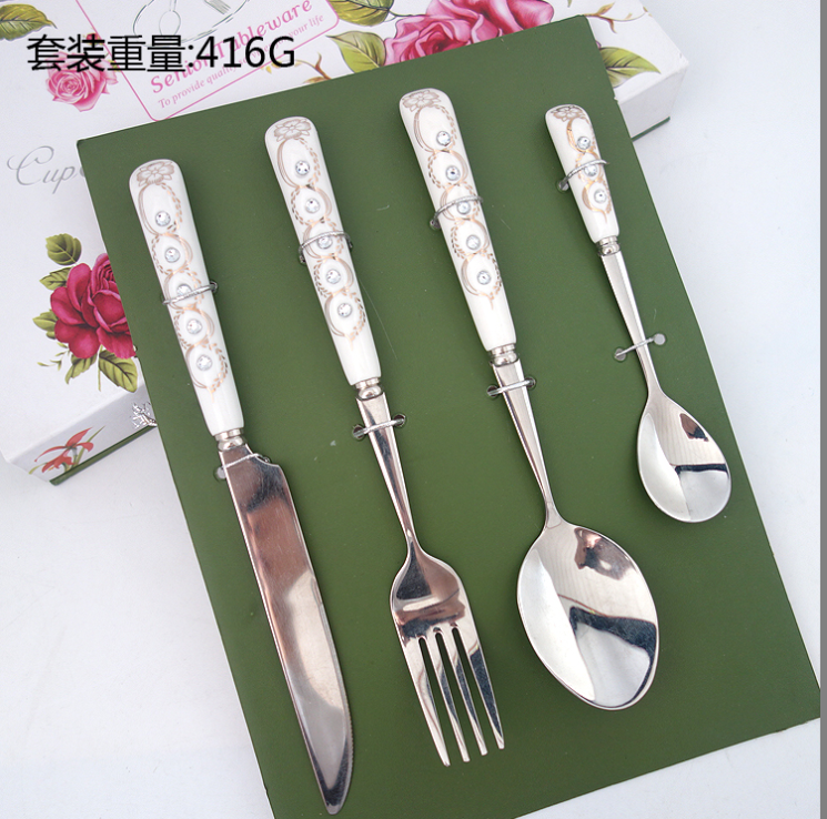餐刀:19.8*1.6CM(49G) 中叉:19.5*2.3CM(40克) 中尖勺:19.3*3.8CM(43克) 小勺:13.5*2.6CM (20克) 盒子:24.5*18.2*3.2CM 外箱: 50*35*38cm