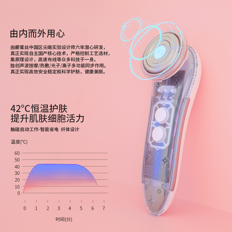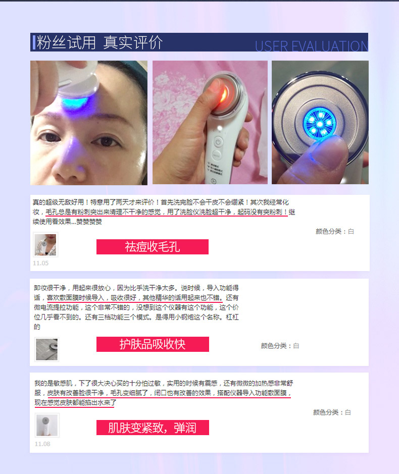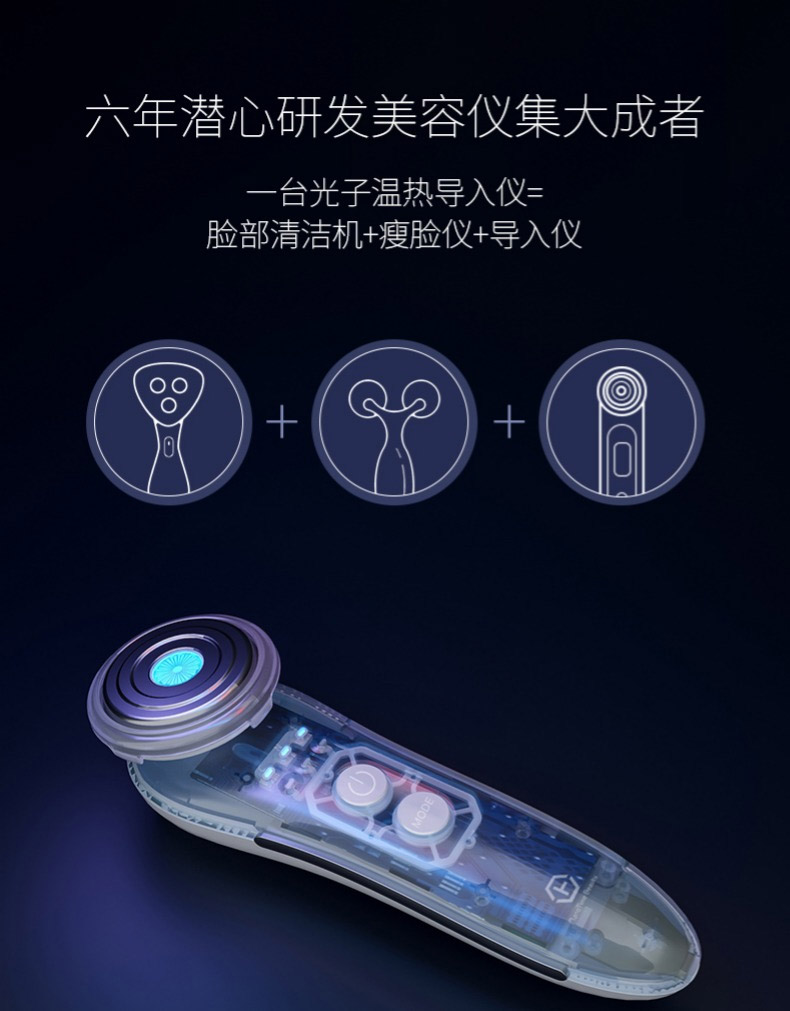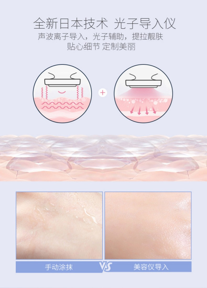 3、多功能同步的光子導入模式,輔助護膚品的吸收,trophoSkin-i的離子功能配合聲波按摩同步導入,熱敷舒緩張開毛孔讓護膚分子更易吸收,光子輔助同步作用,帶來全新的美容護膚體驗