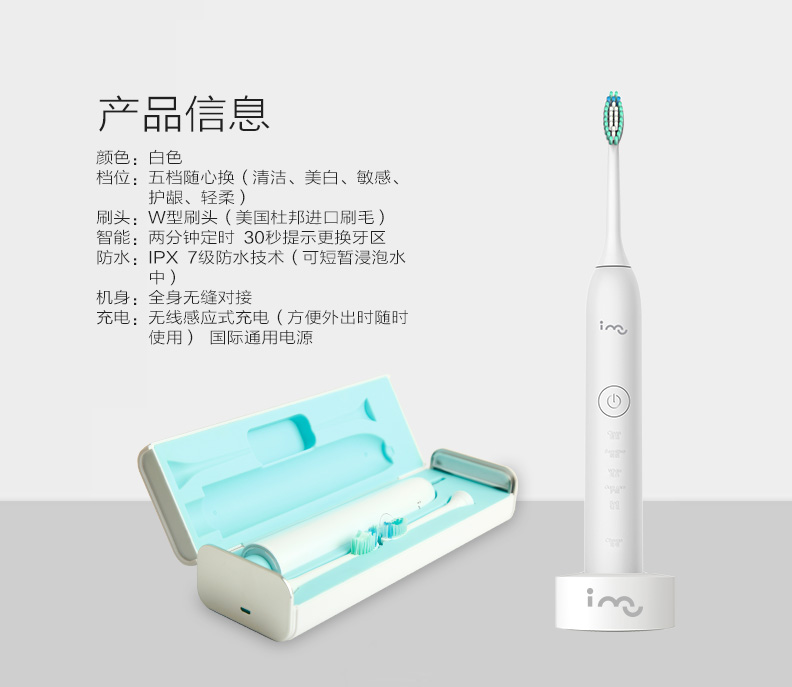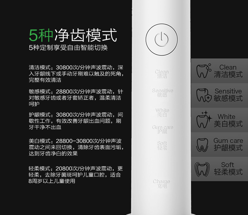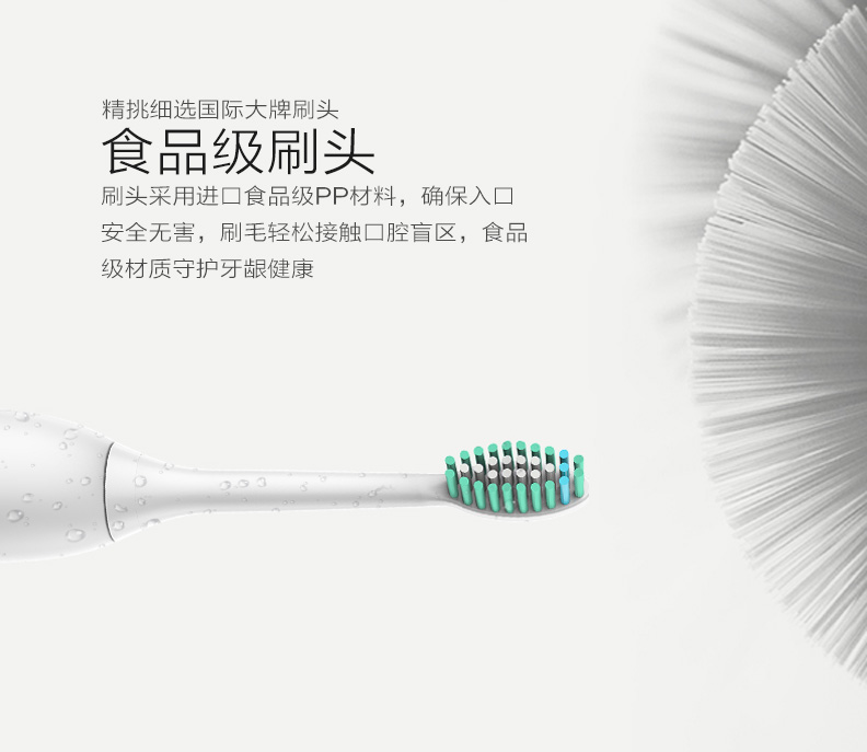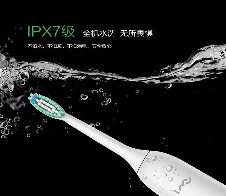 食品級PP材質刷頭,杜邦刷毛,五檔凈齒模式選擇,IPX7級別防水,