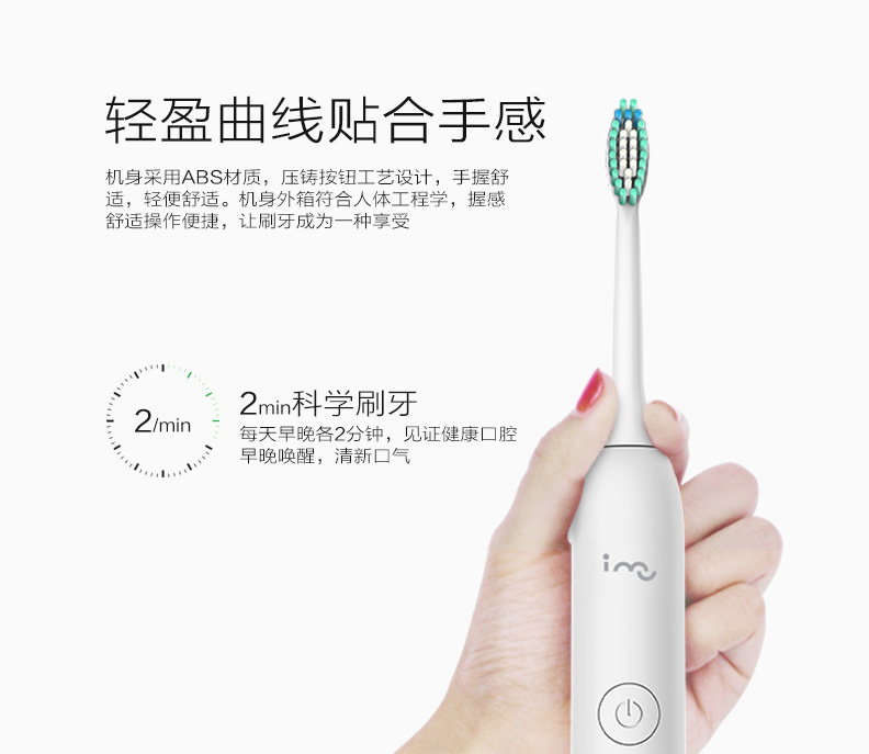 機身外箱符合人體工程學,握感舒適操作便捷,讓刷牙成為一種享受